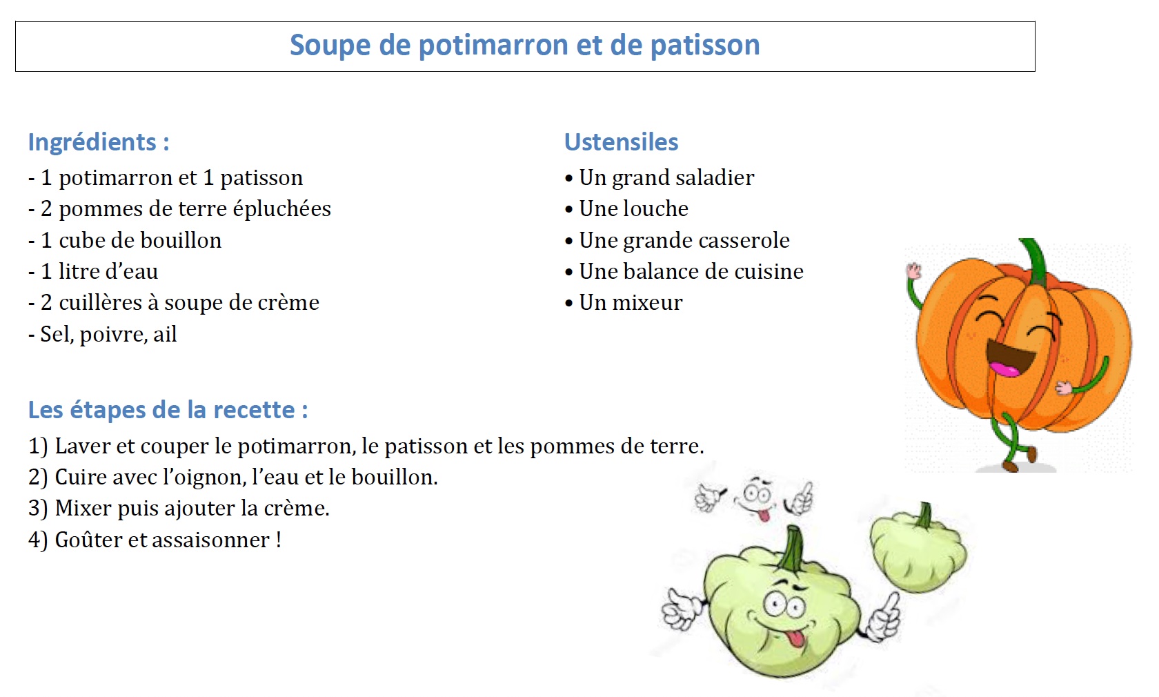 – une délicieuse soupe à partir des légumes du potager : potimarrons, pâtissons, aubergines, tomates…