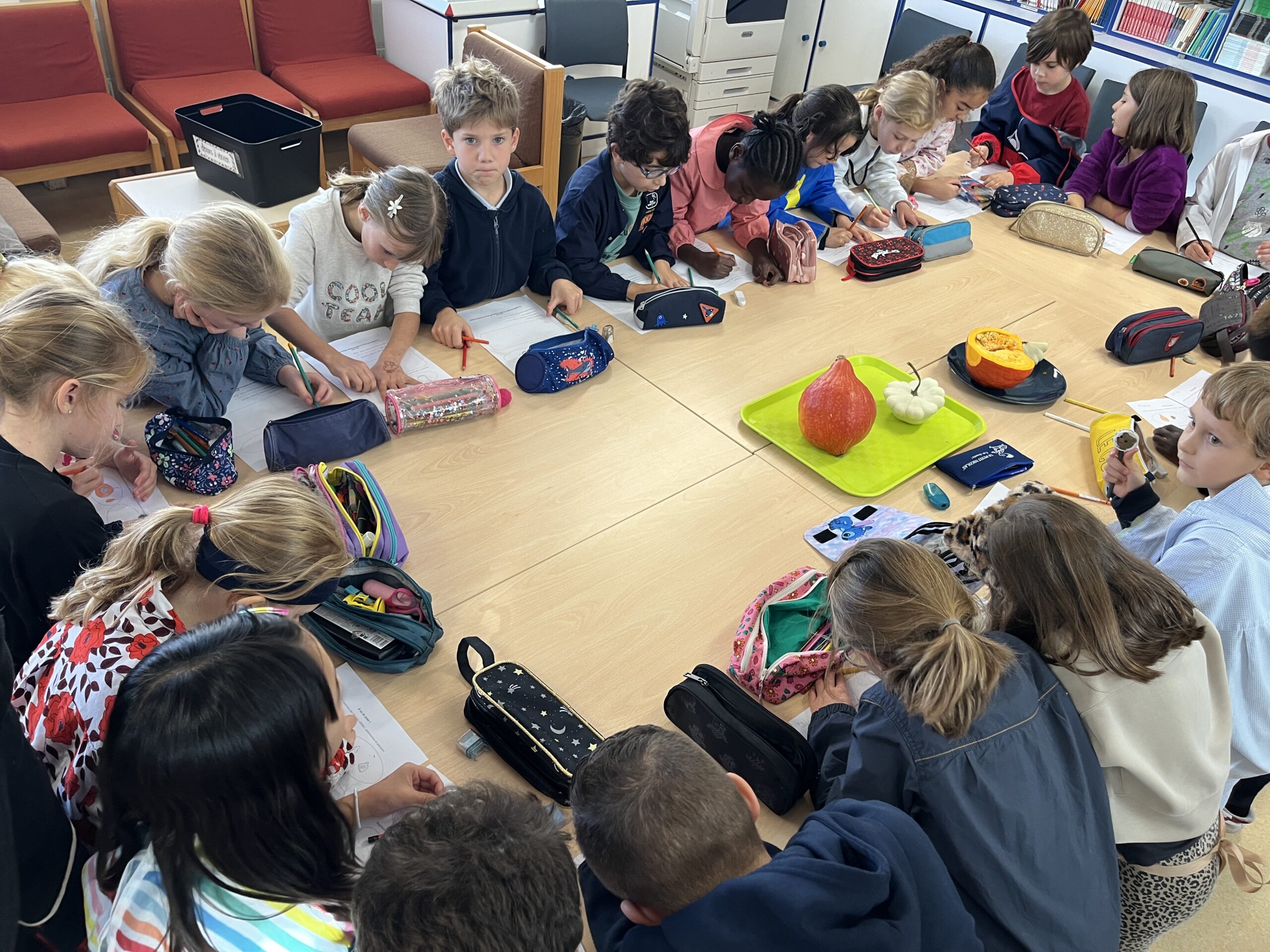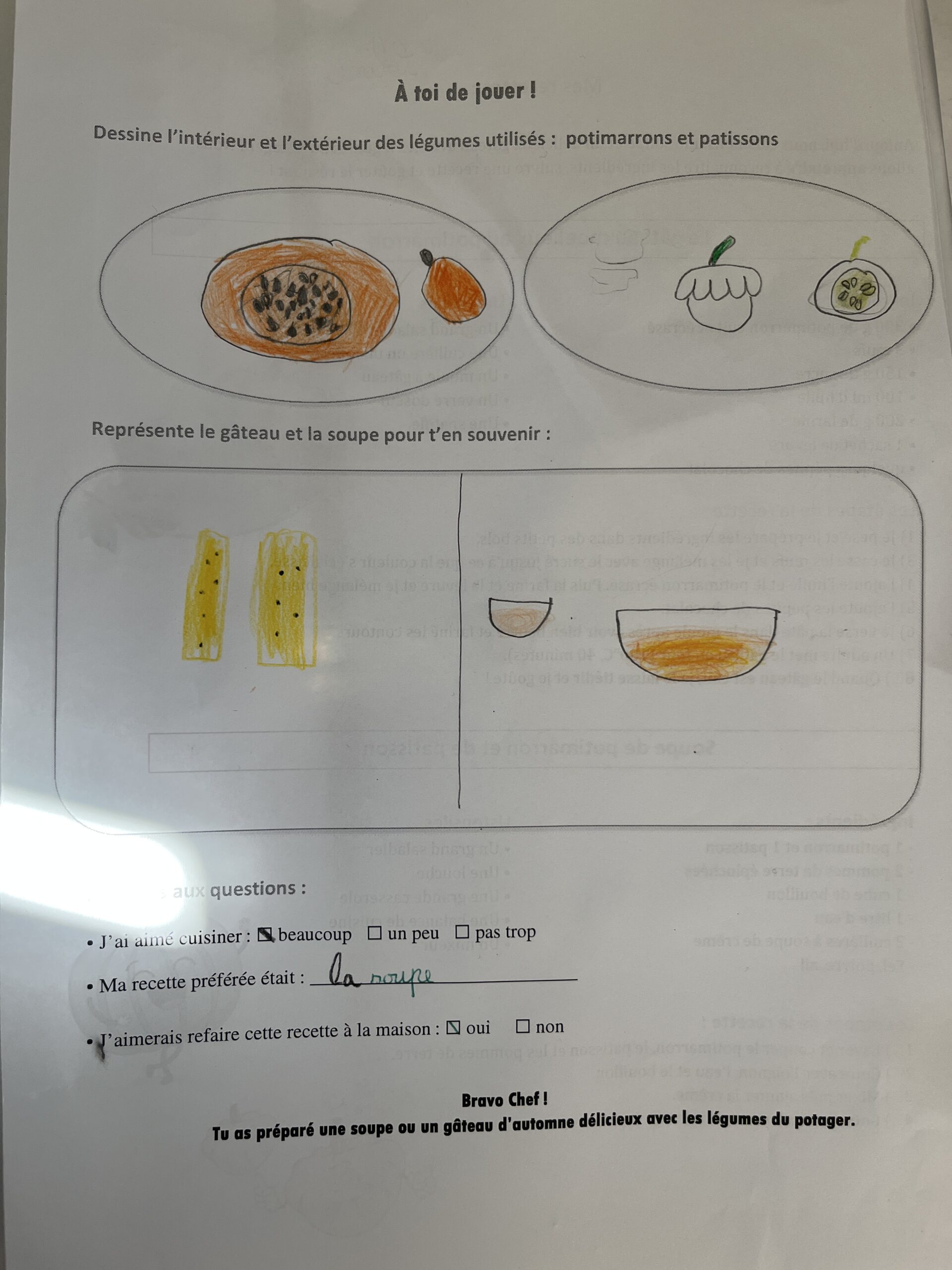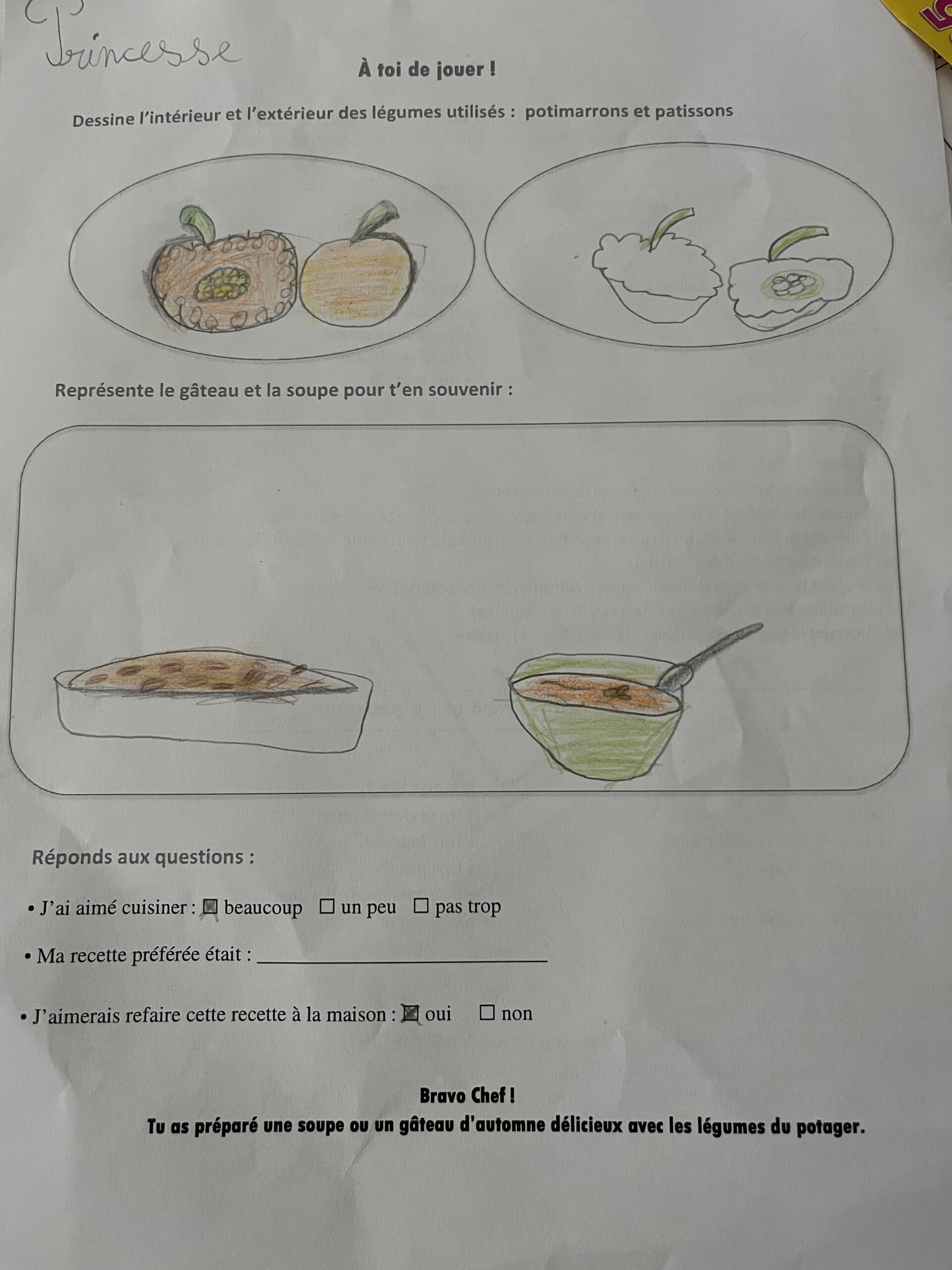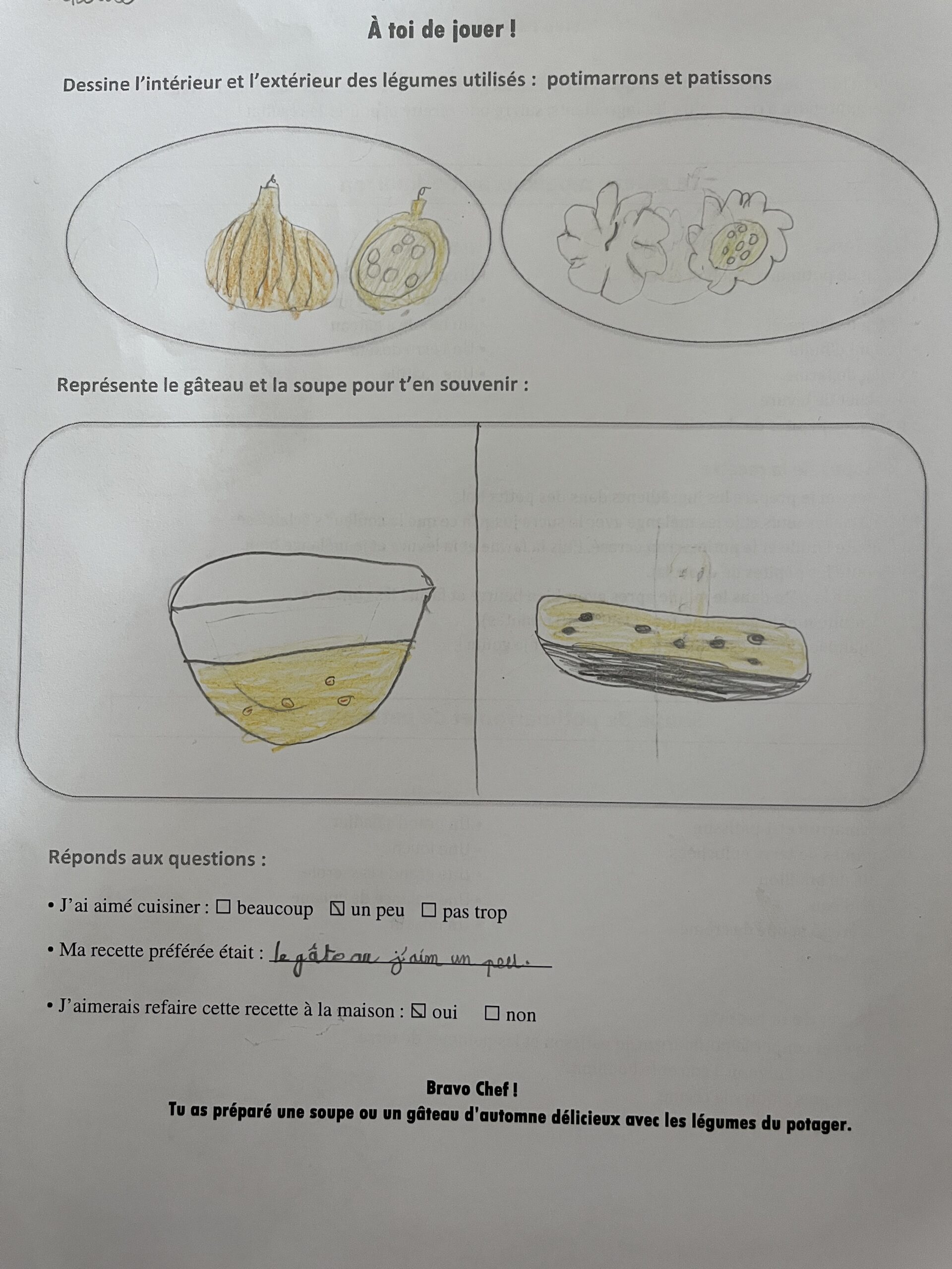 Après avoir différencié les saveurs et les 4 zones des papilles qui permettent de les différencier, nous nous sommes attelés à un atelier découverte des légumes avant de les « croquer » sur papier et dans nos recettes.
